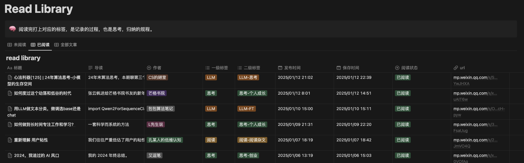 文本内容和格式准备好以后就好说了,我把这个流程梳理成pipeline,使用ChatGPT和github copilot实现了一下,读取url,获取内容,获取作者和发布时间,在Notion数据库中创建页面并保存内容。基本达到了我的要求,我还在Notion数据库中添加了标签的字段,方便我阅读完后进行打标签梳理。