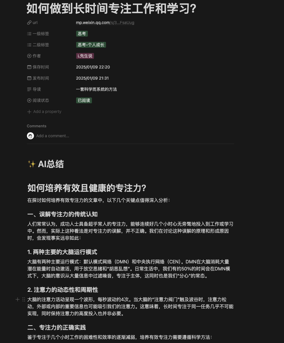具体保存的位置我选择的是Notion,Notion基本是我的第二大脑,我所有的文本相关的数据都存储在Notion中,支持全局搜索和Notion AI,并且Notion API也很好用,支持数据上传和修改,非常方便。