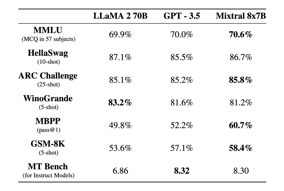 Mixtral 8x7B与LLaMA模型的区别就是在attention计算中将MLP Layer替换成了一个门控层和8个专家模型,通过门控层会给出每个专家层的权重,每个token会选择top2的专家进行计算, 这使得模型训练和推理的速度相比于LLaMA 2 70B会显著提高。