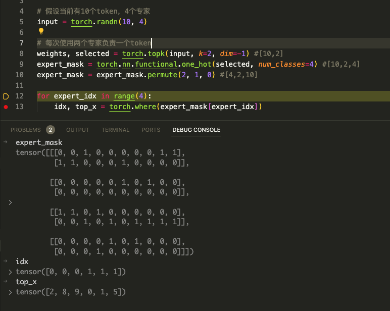 我们通过torch.where(expert_mask) 来进行解析这个结果,得到的idx 中的0代表了当前专家作为top1需要负责的token,1代表了当前专家作为top2需要负责的token,对应的top_x 则代表了当前专家负责的token的索引位置,将idx和top_x 组合就得到了当前专家作为top1、top2负责的token的索引,例如(0,2)、(0,8)、(0,9)、(1,0)、(1,1)、(1,5),对应的意思就是当前专家作为top1负责的token索引为2、8、9,当前专家作为top2负责的token索引为0、1、5。