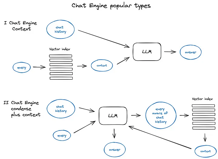 另一个更复杂的方法是CondensePlusContextMode,在这种模式中,每次交互都会将聊天历史和最后一条消息压缩成一个新的query,然后这个query会进行检索索引,检索到的上下文连同原始的用户消息一起发送给LLM,生成答案。